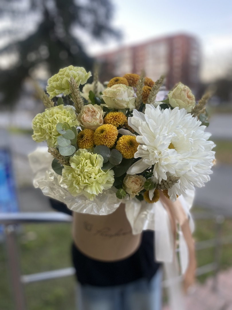 Данная цветочная композиция под запрос. Это значит что возможно у нас отсутствует какой-либо цветок в составе букета. Но мы готовы собрать похожую композицию, не чуть не менее красивую чем эта. Вы можете оставить заявку. И мы свяжемся с вами и предложим возможные варианты.