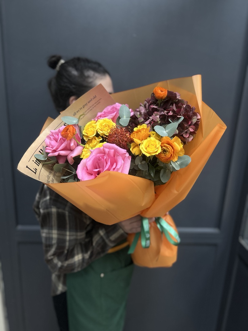 Данная цветочная композиция под запрос. Это значит что возможно у нас отсутствует какой-либо цветок в составе букета. Но мы готовы собрать похожую композицию, не чуть не менее красивую чем эта. Вы можете оставить заявку. И мы свяжемся с вами и предложим возможные варианты.