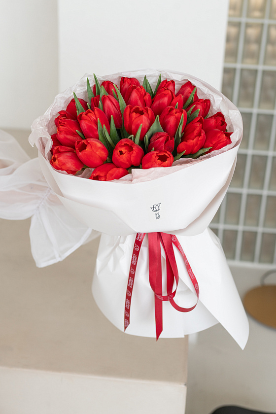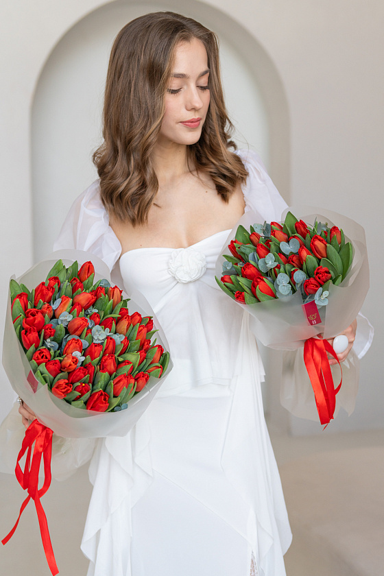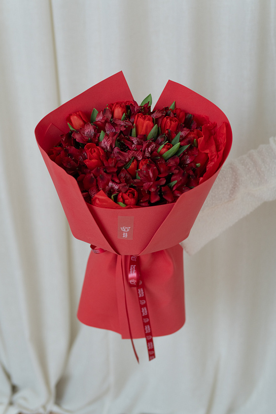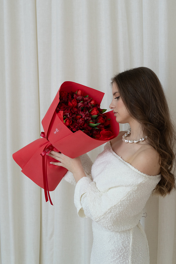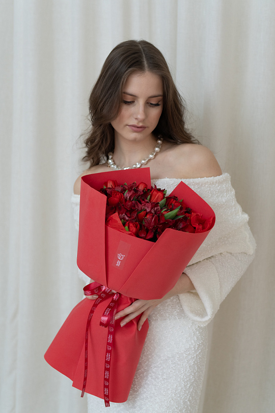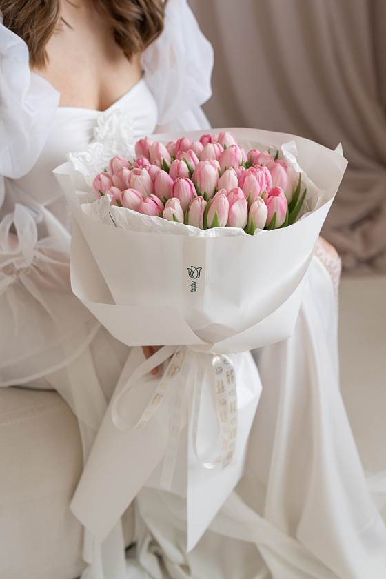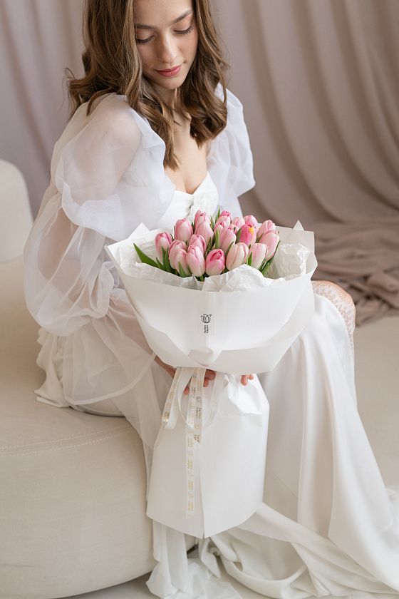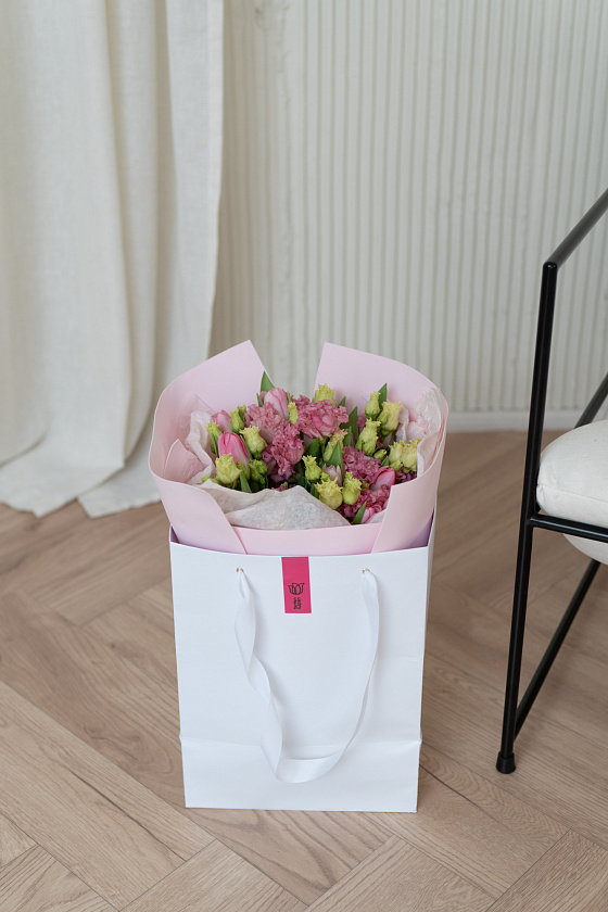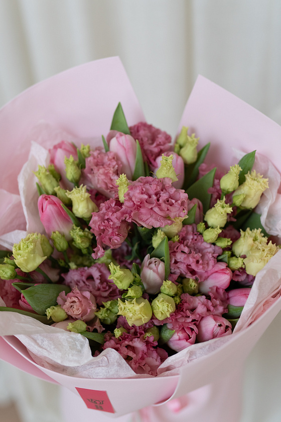 Букет из розовых тюльпанов и эустом Трепет счастья