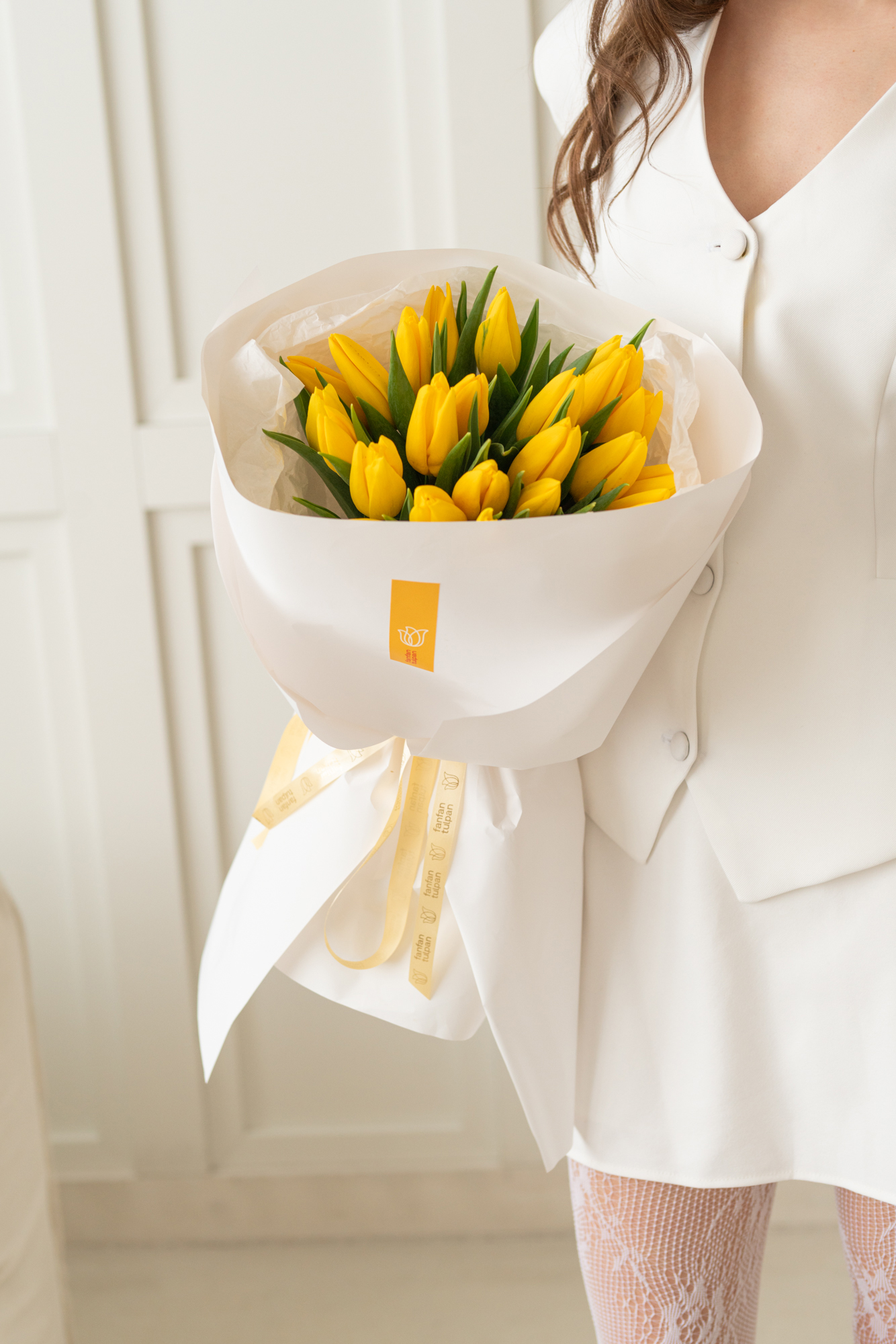 Букет из желтых тюльпанов – это изысканное произведение природы, в котором утонченная красота каждого цветка объединяется с яркими и солнечными оттенками желтого. Эти цветы несут в себе символику радости, счастья и оптимизма, и являются прекрасным примером природной чарующей эстетики.