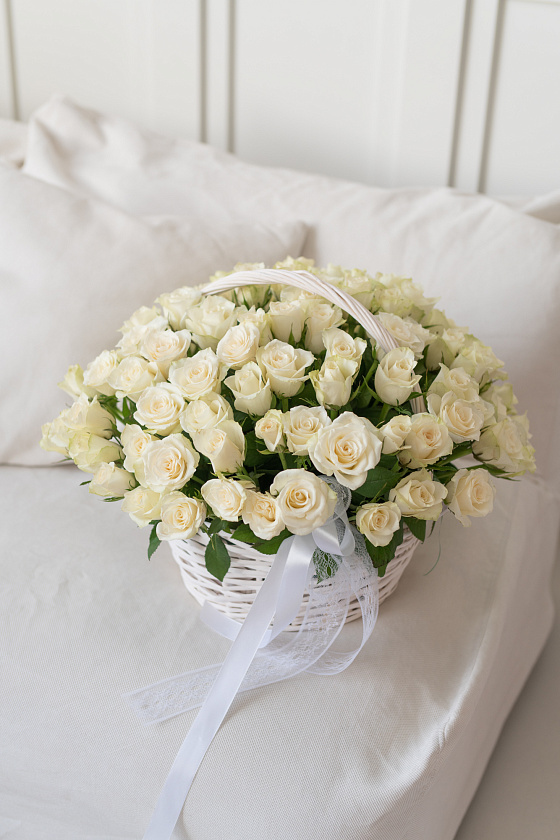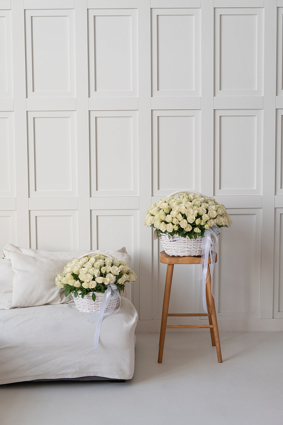 Особенно популярны большие корзины с классическими алыми сортами. Их дарят на юбилей, день рождения, 8 Март или 14 Февраля. Варианты со светлыми бутонами часто покупают на свадьбу или годовщину отношений.