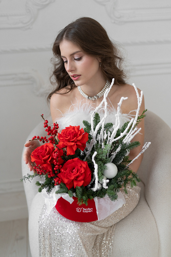 Для родственников и друзей подойдет авторская композиция из ели, пихты, туи. Флористы дополнительно украсят букет игрушками, шишками, веточками хлопка, яркими шарами и лентами.