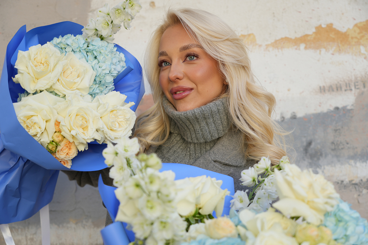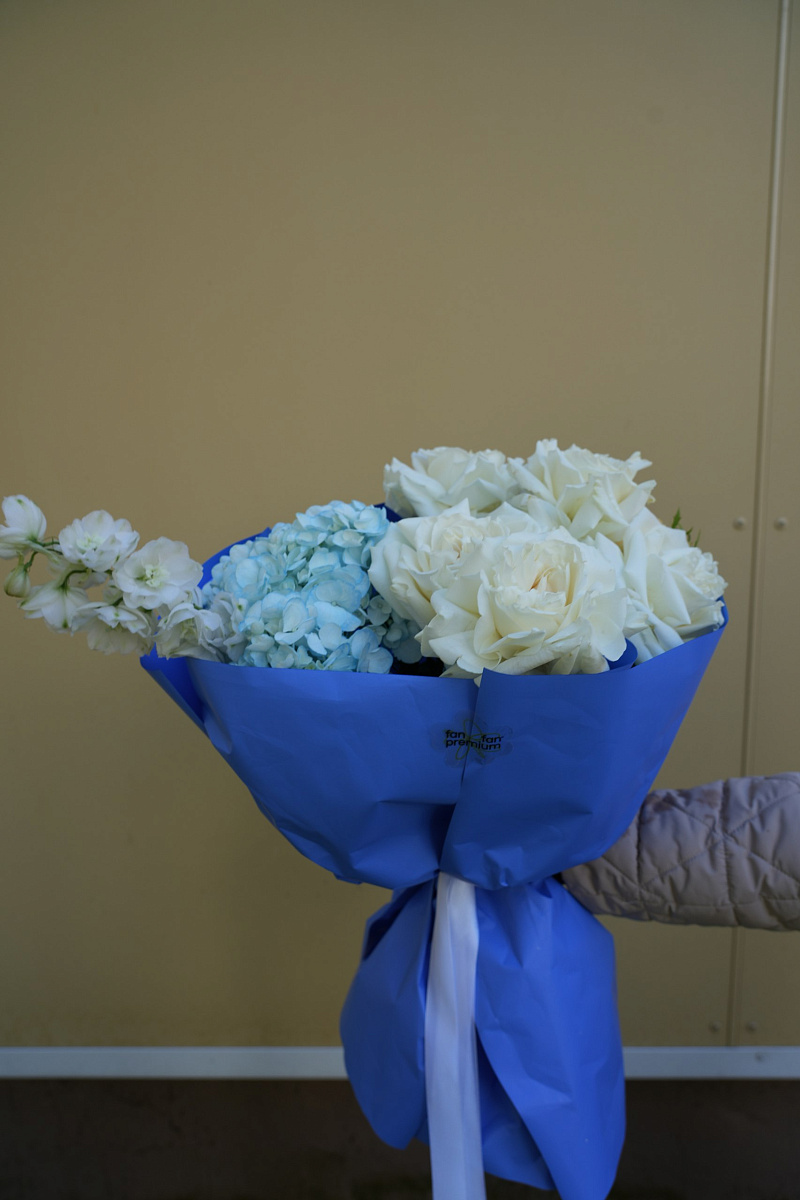 Этот изысканный букет "Фианит" объединяет в себе свежие белые розы с бархатистыми лепестками и лёгким ароматом, дополненных пышными соцветиями голубой гортензии, формируя композицию, полную свежести и гармонии. Цветы мастерски уложены в объёмную форму, напоминающую облако, с элементами зелени и декоративными акцентами, подчёркивающими нежный контраст белого и голубого.