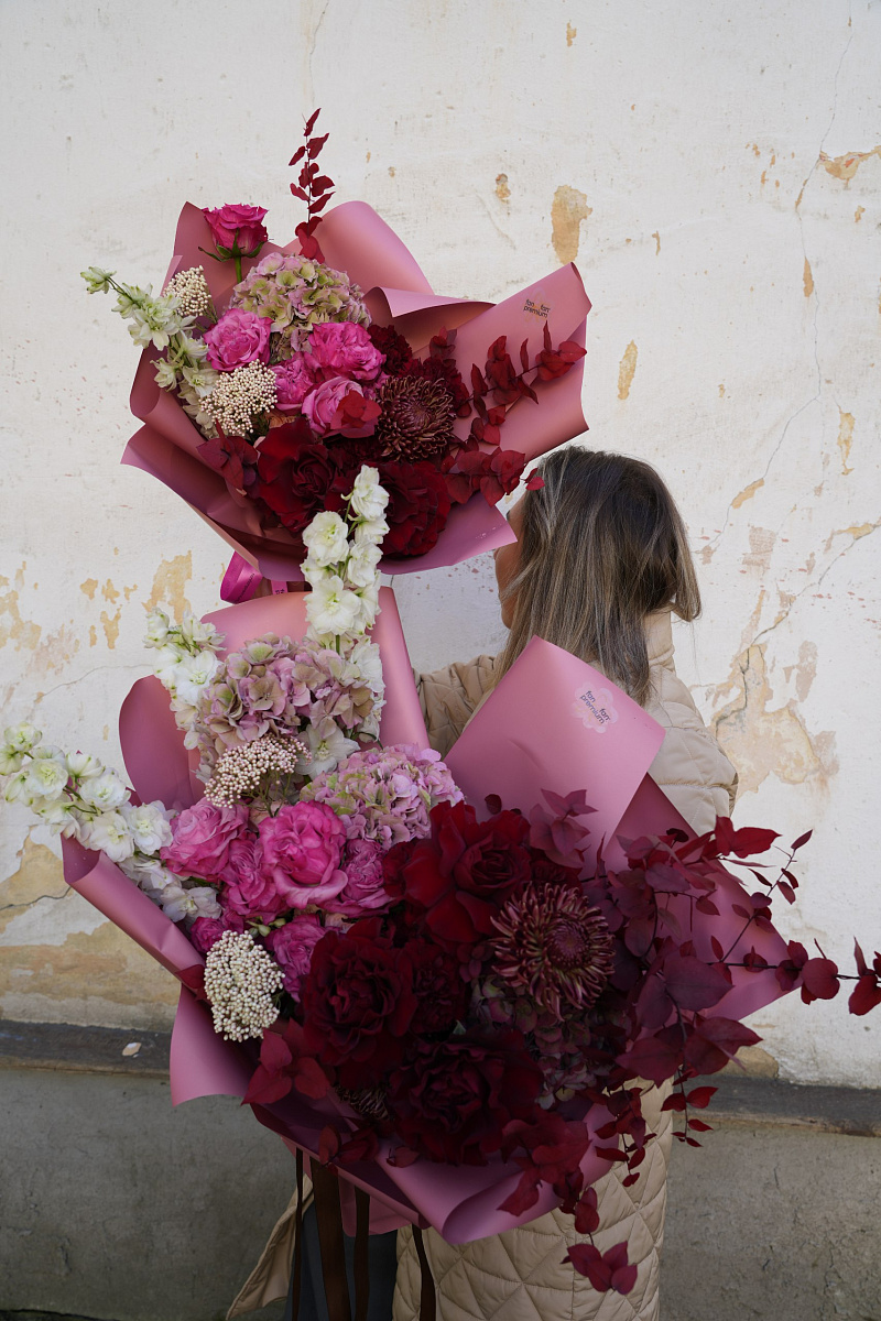 Розы ,Дельфиниум ,Хризантема одноголовая ,Гортензия ,Эвкалипт стабилизированный