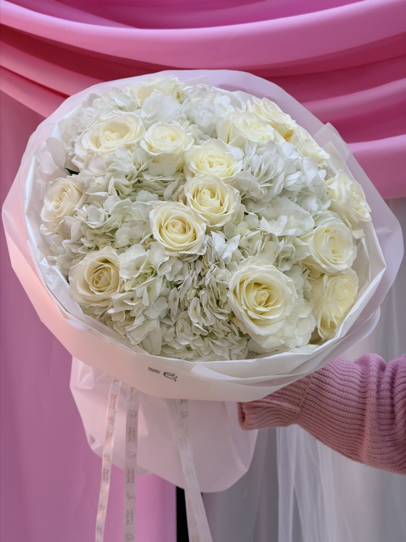Изысканный белоснежный букет из гортензий и роз — образец классической красоты и утончённого вкуса. Крупные шаровидные соцветия гортензий создают объёмную основу композиции, а благородные розы добавляют ей структурности и элегантности.