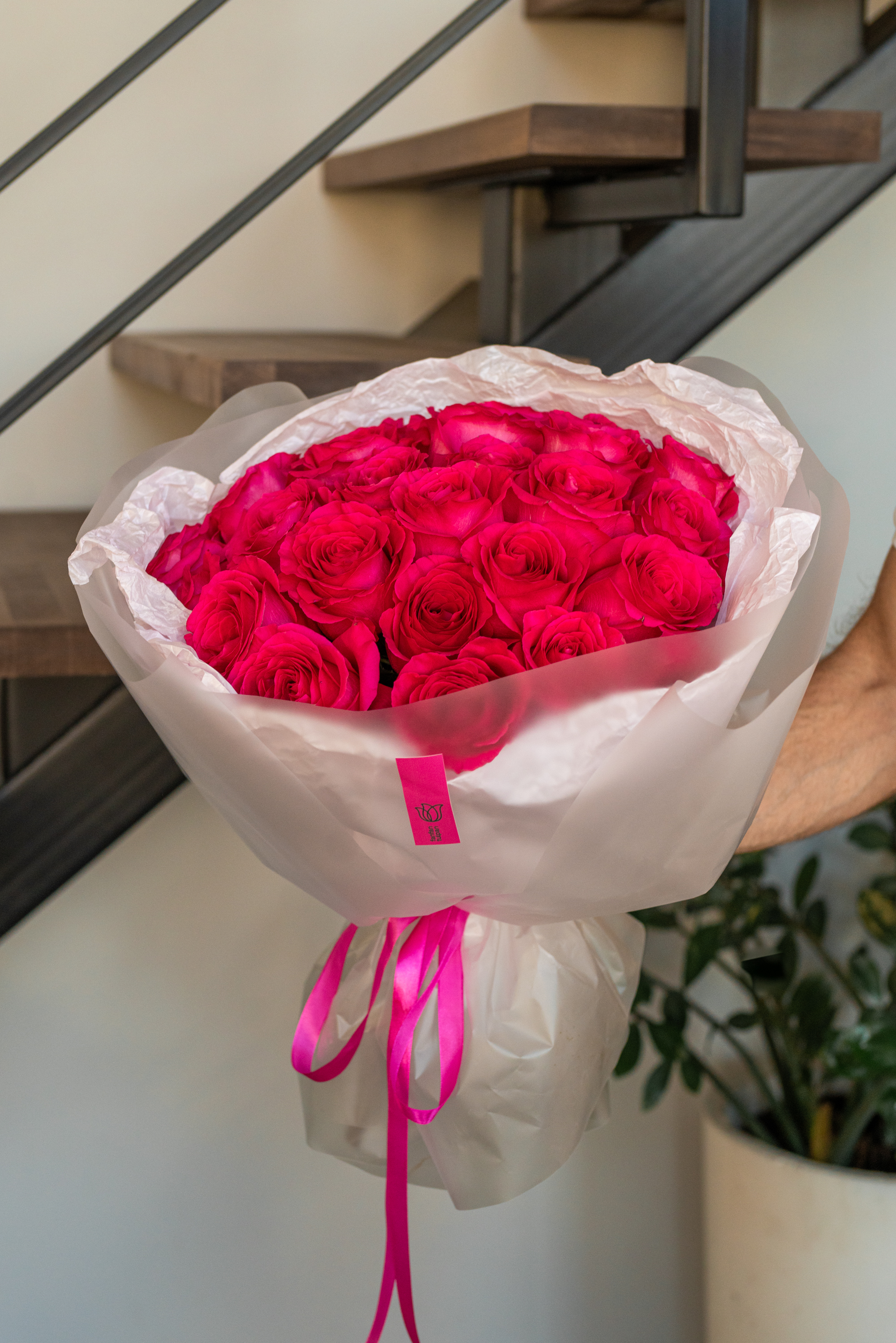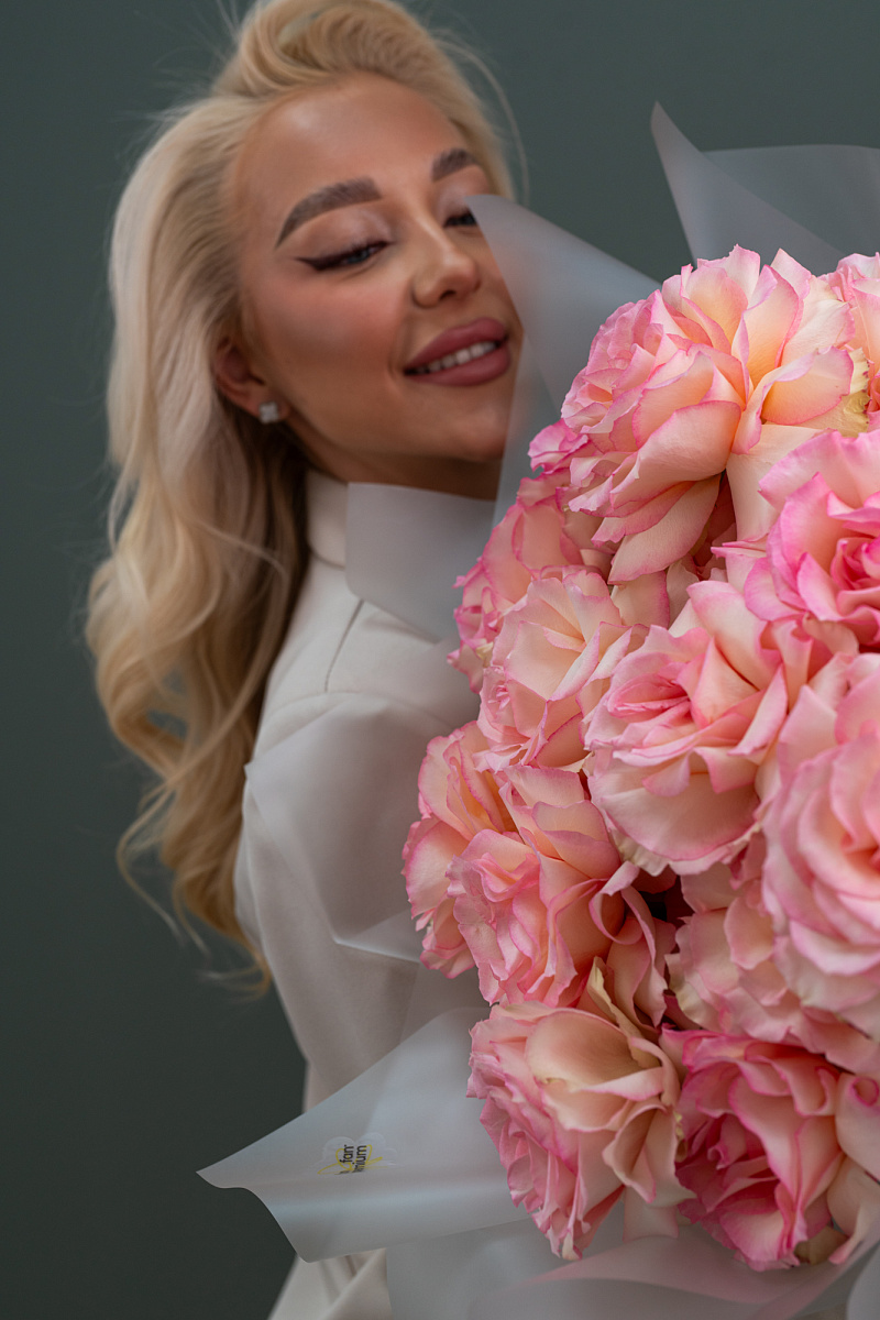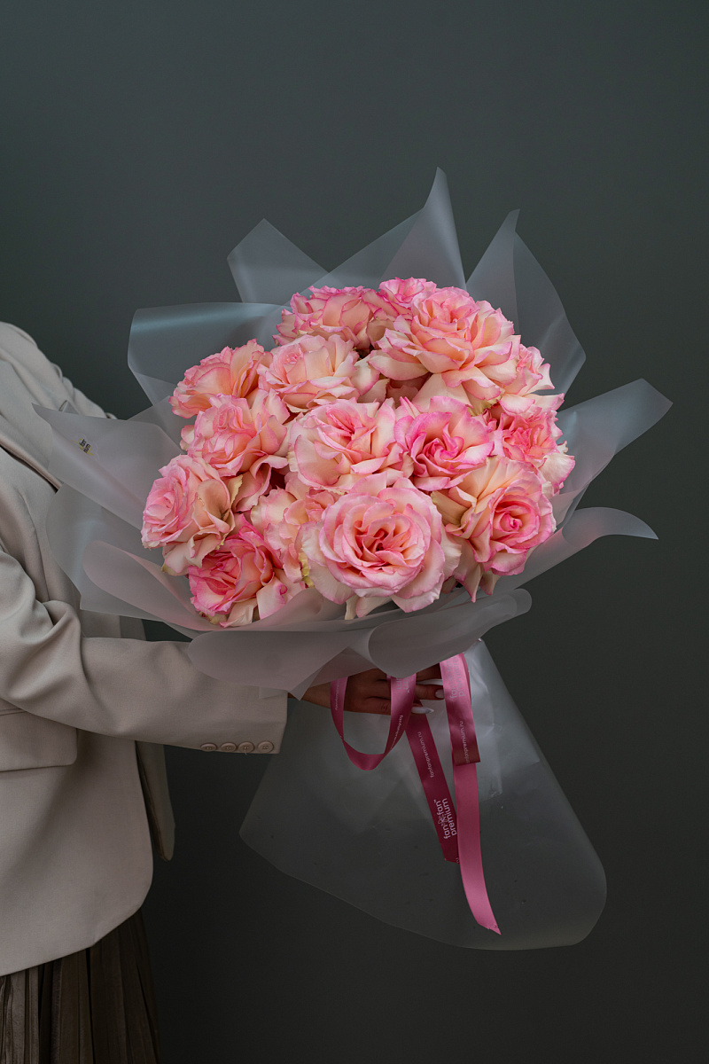 Букет транспортируется с Аквабоксе и Коробке-Трапеции, либо в Аквабоксе и Фирменном пакете.