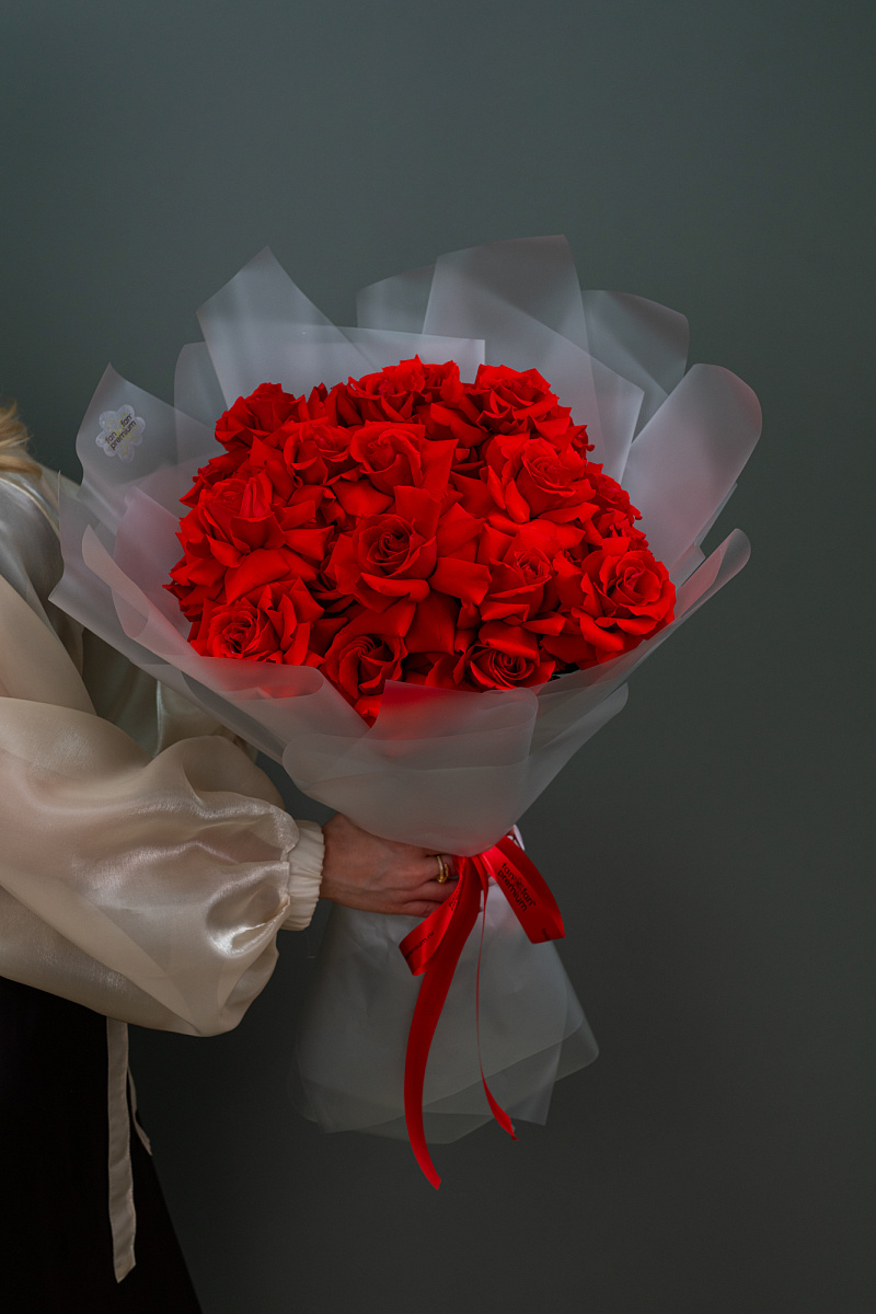 Это очаровательное собрание из 25 красных пышных бутонов сорта Nina создает яркий и выразительный аккорд красоты и страсти. Насыщенный алый оттенок подчеркивает силу эмоций и глубину переживаний, заставляя сердце биться чаще. Бутоны с округлой формой и плотной структурой выглядят особенно эффектно благодаря шелковистой фактуре лепестков и глубокому благоуханию.