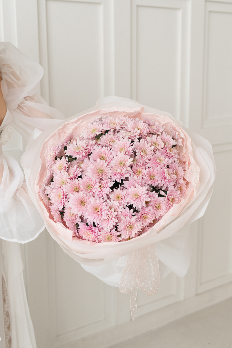 Изысканный букет из нежно‑розовых хризантем — воплощение утончённой красоты и благородства. Пышные соцветия с мягкими переливами оттенка создают ощущение невесомости и нежности. Этот букет станет безупречным акцентом в интерьере или выразительным подарком для тех, кто ценит сдержанную роскошь и природную гармонию.