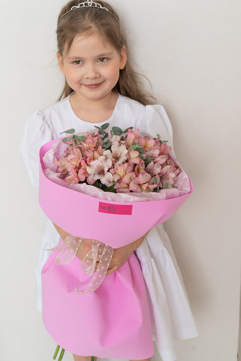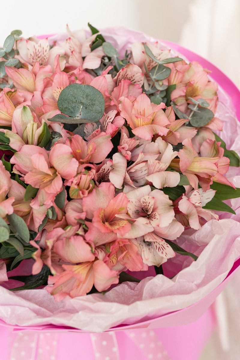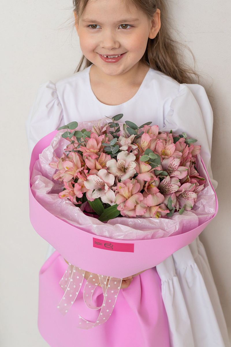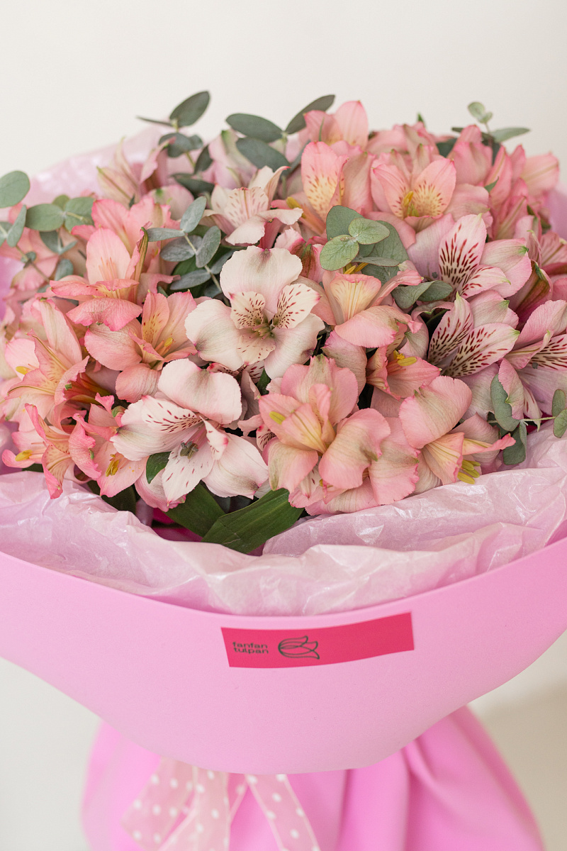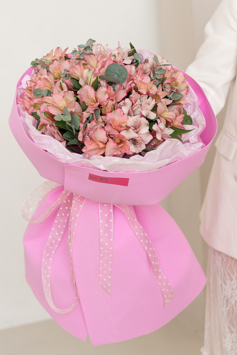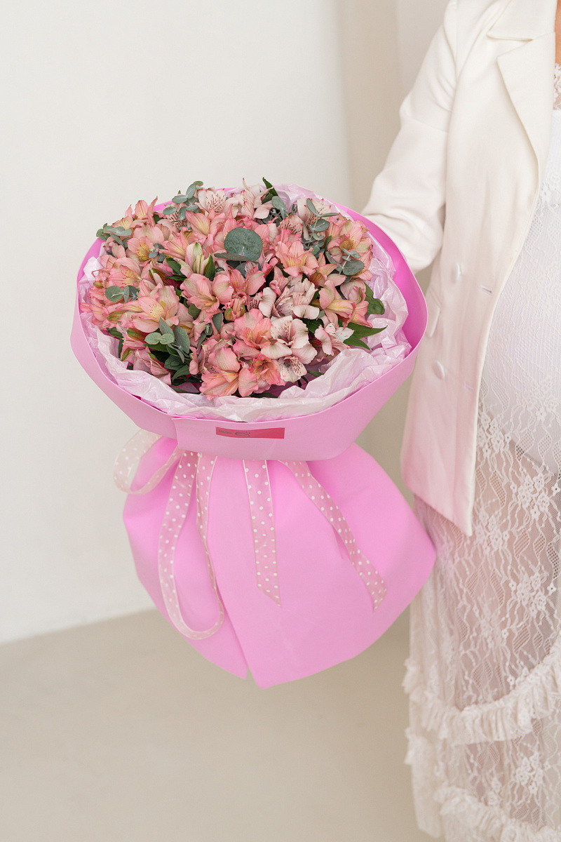 Грациозный букет из розовых альстромерий — знак глубокого уважения и восхищения. Его мягкий оттенок символизирует искренность намерений и теплоту отношений. Идеален для поздравления с днём рождения, юбилеем или другим значимым событием, где важно выразить добрые чувства без пафоса.