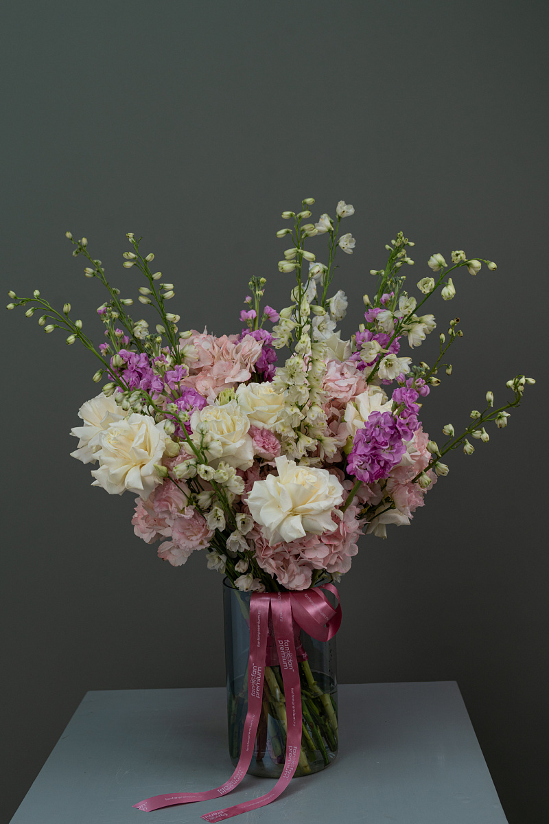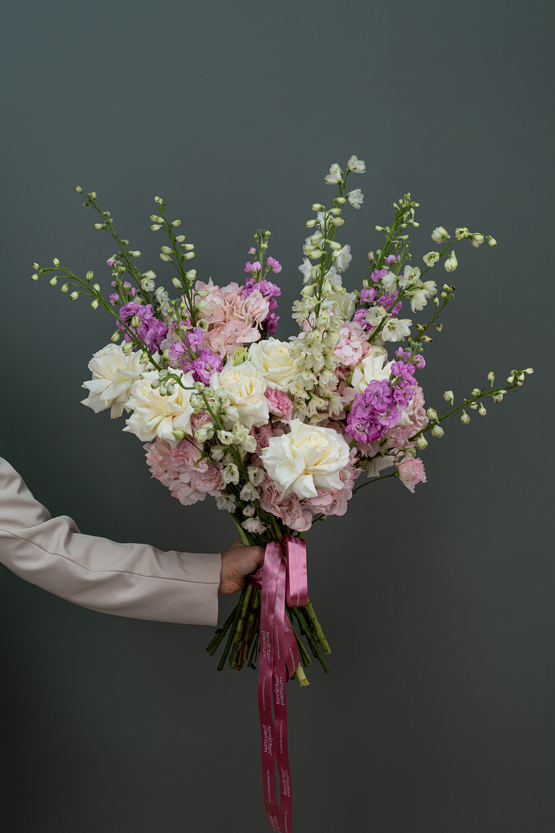 Букет представляет собой сочетание белоснежных роз, небесно-голубых оттенков дельфиниума и деликатных розовых цветов матиолы. Эта композиция воплощает легкость, романтику и чистоту чувств, создавая гармоничный образ весны и вдохновения. Подходит как идеальный подарок для любимых, друзей или украшения особого случая.