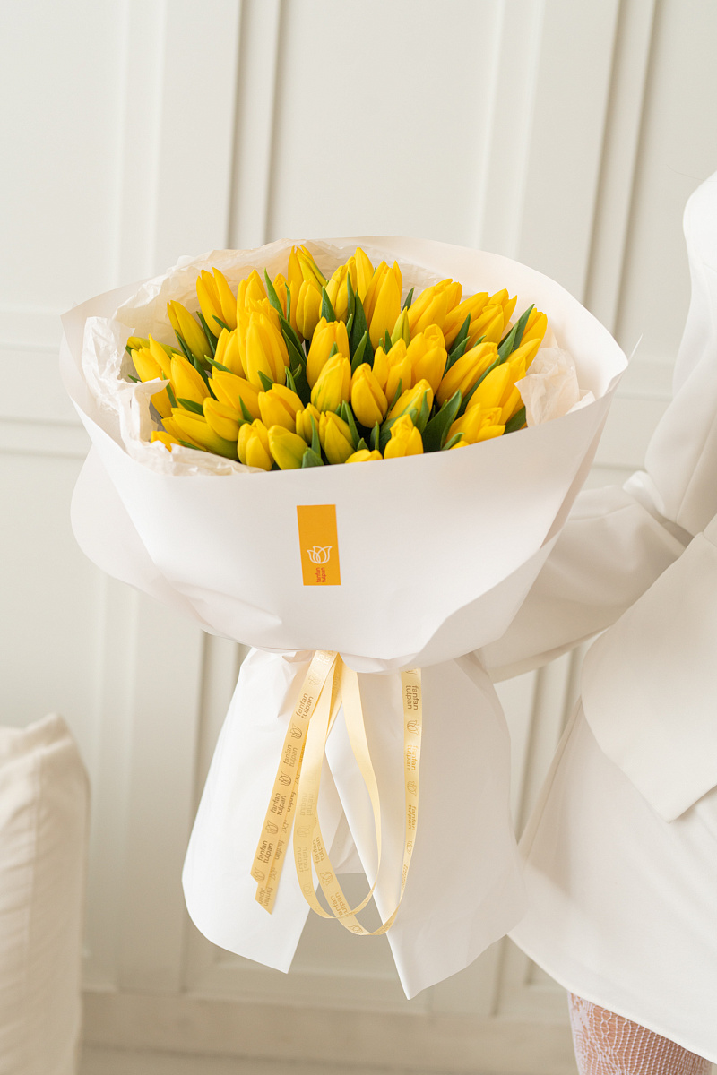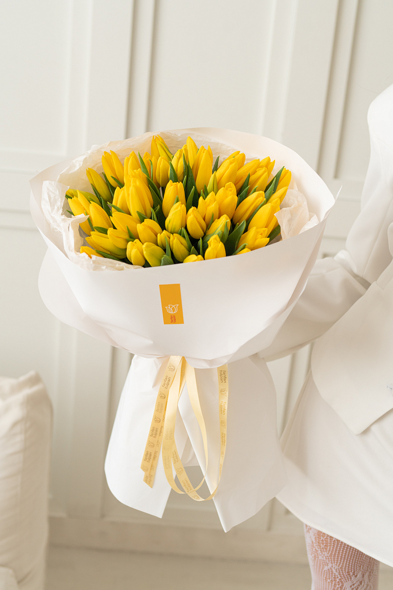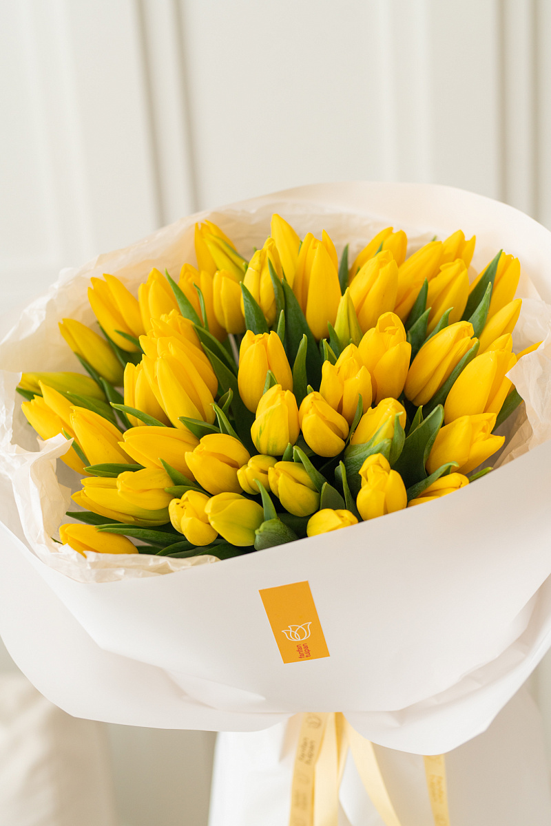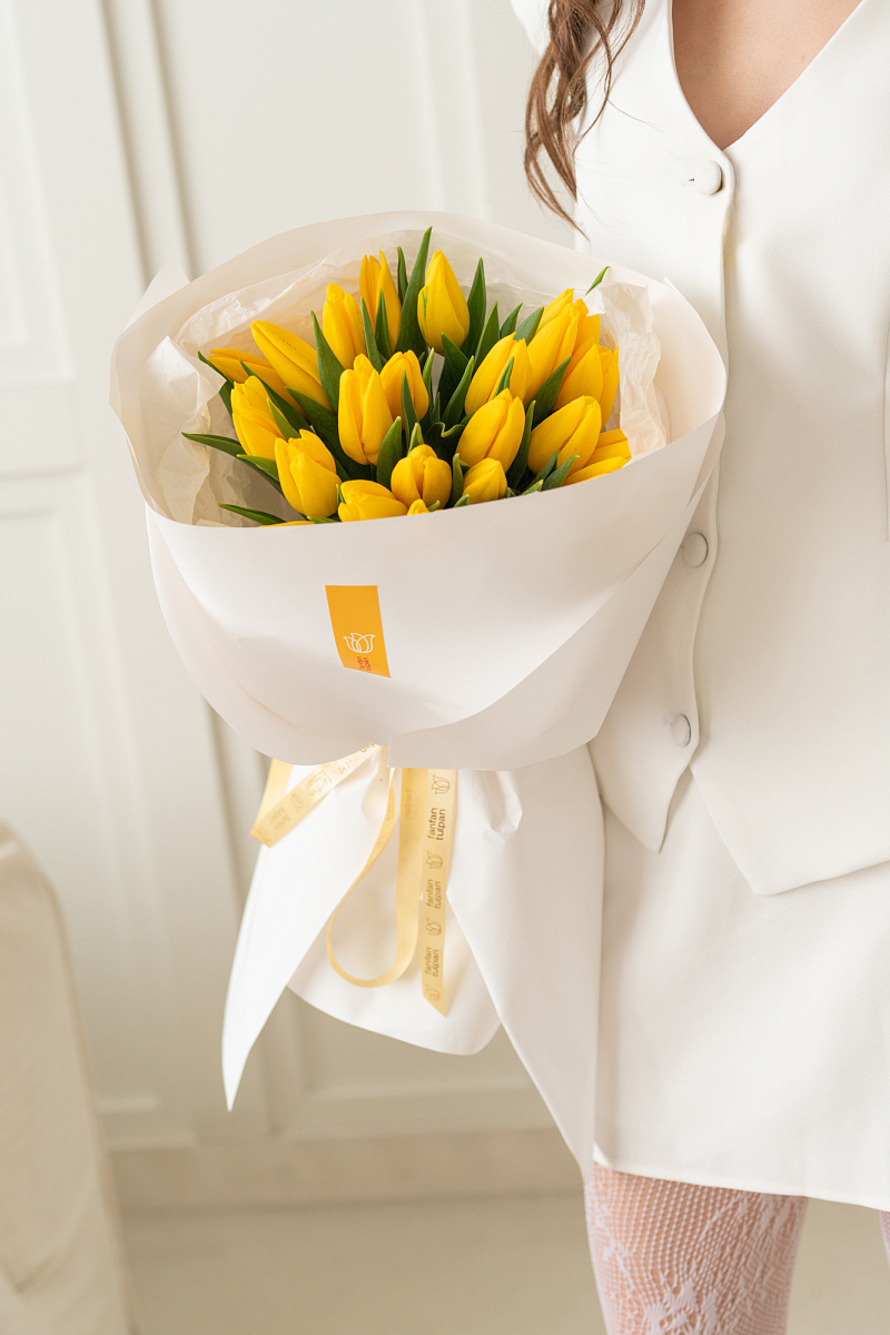 Сочный букет из жёлтых тюльпанов — выразительный способ сказать: „Я рад за твои успехи!“. Его жизнерадостный цвет символизирует энергию, процветание и новые возможности. Отличный выбор для поздравления коллег, друзей или близких с важными достижениями.