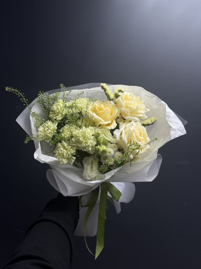 Изящная цветочная композиция с белоснежными розами и нежными кремовыми сантини воплощает в себе тонкую игру света и тени, отражающую всю прелесть осенней поры.