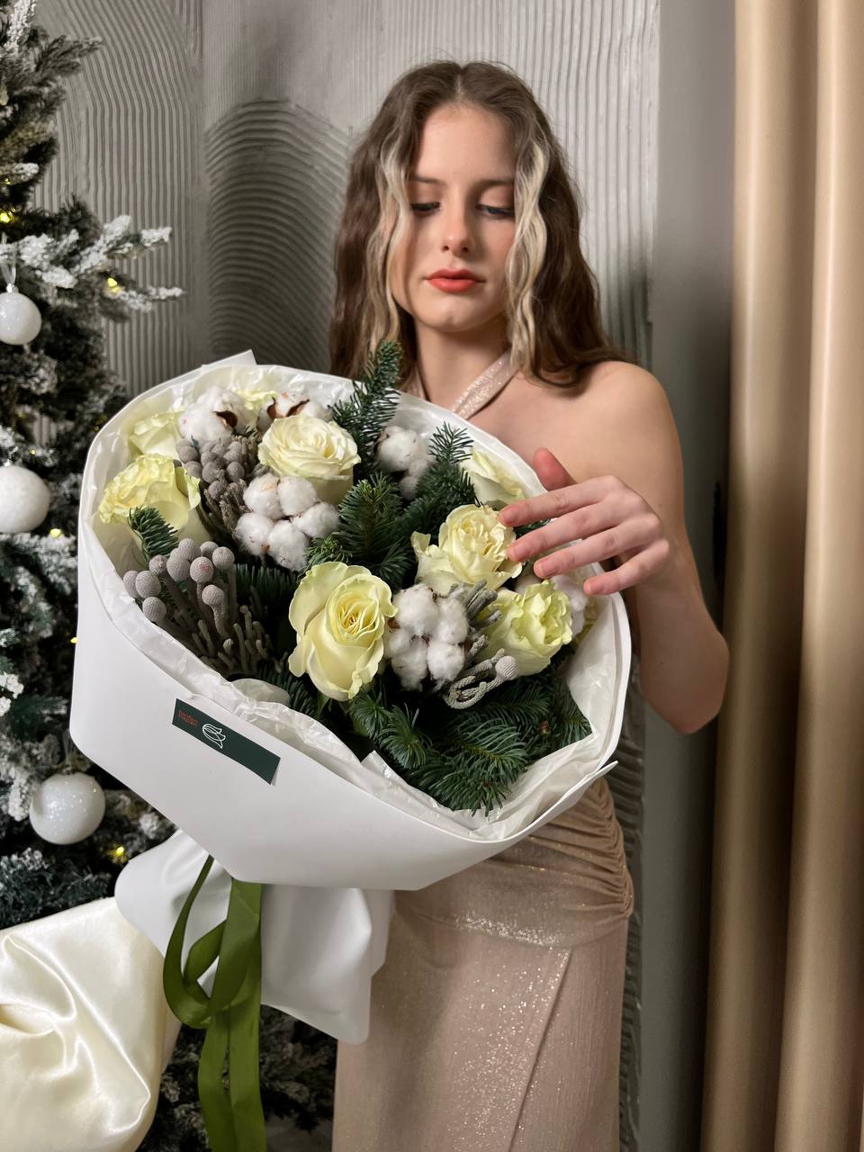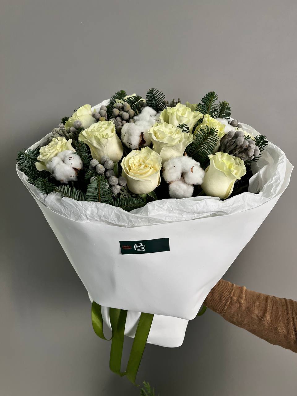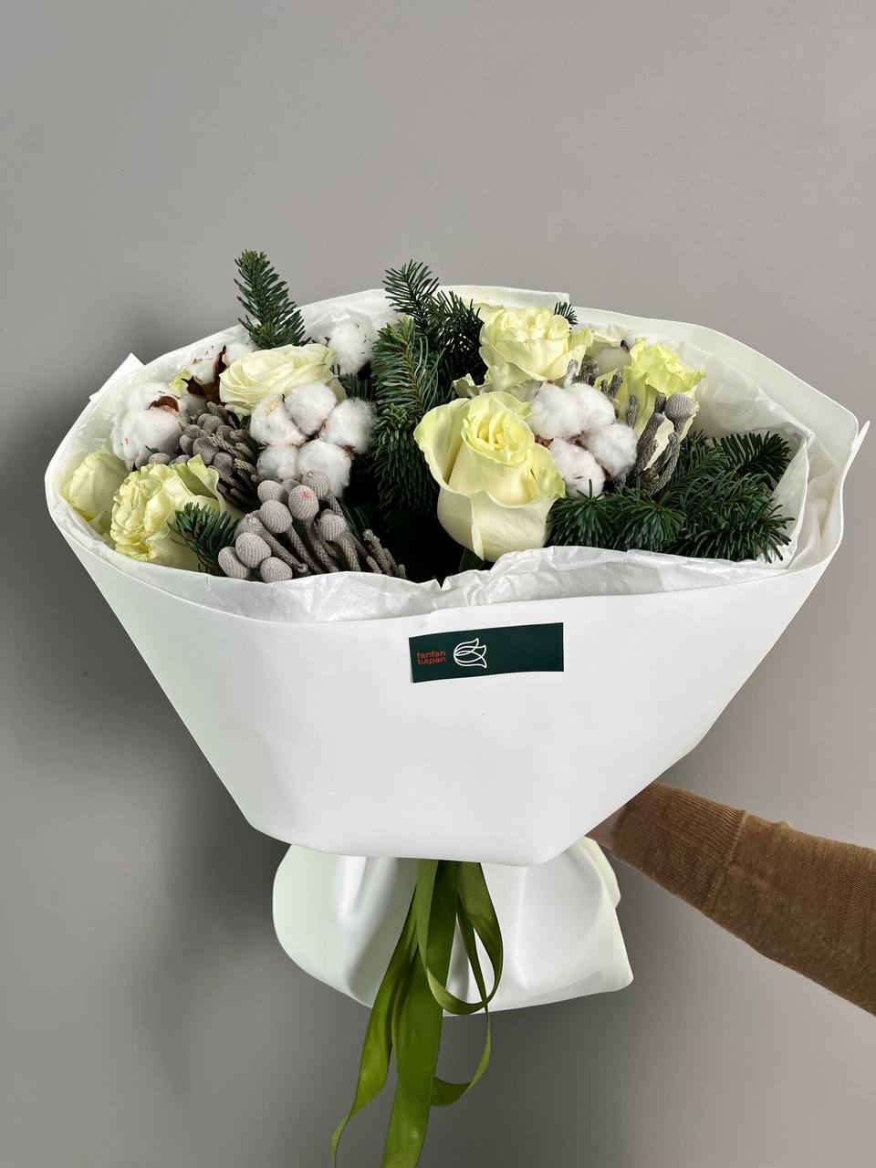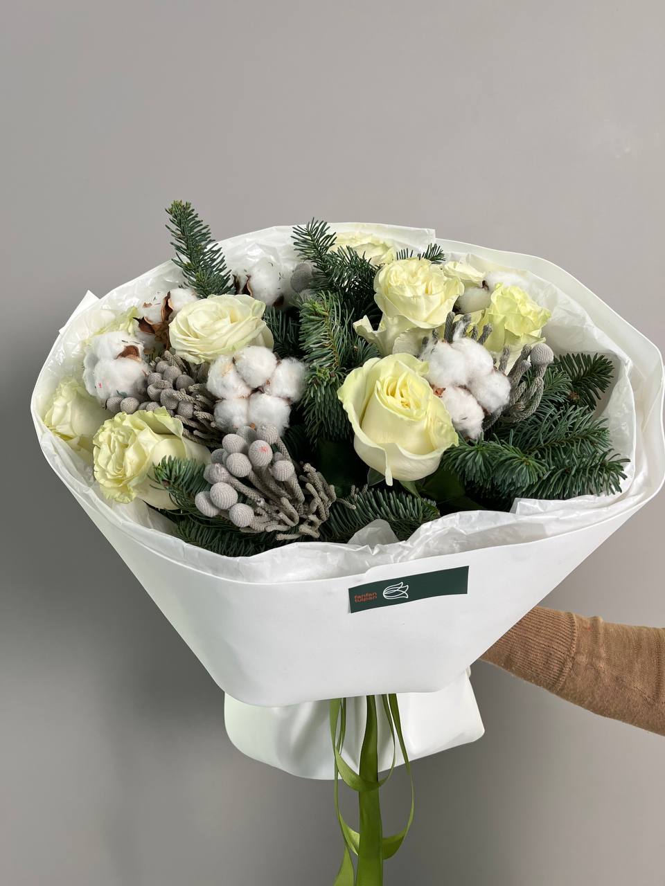 Новогодний букет из нобилиса, роз и хлопка — это стильное и ароматное украшение, которое создаёт атмосферу праздника. Такие композиции сочетают в себе благородную хвою нобилиса и мягкие коробочки хлопка, дополненные декоративными элементами.