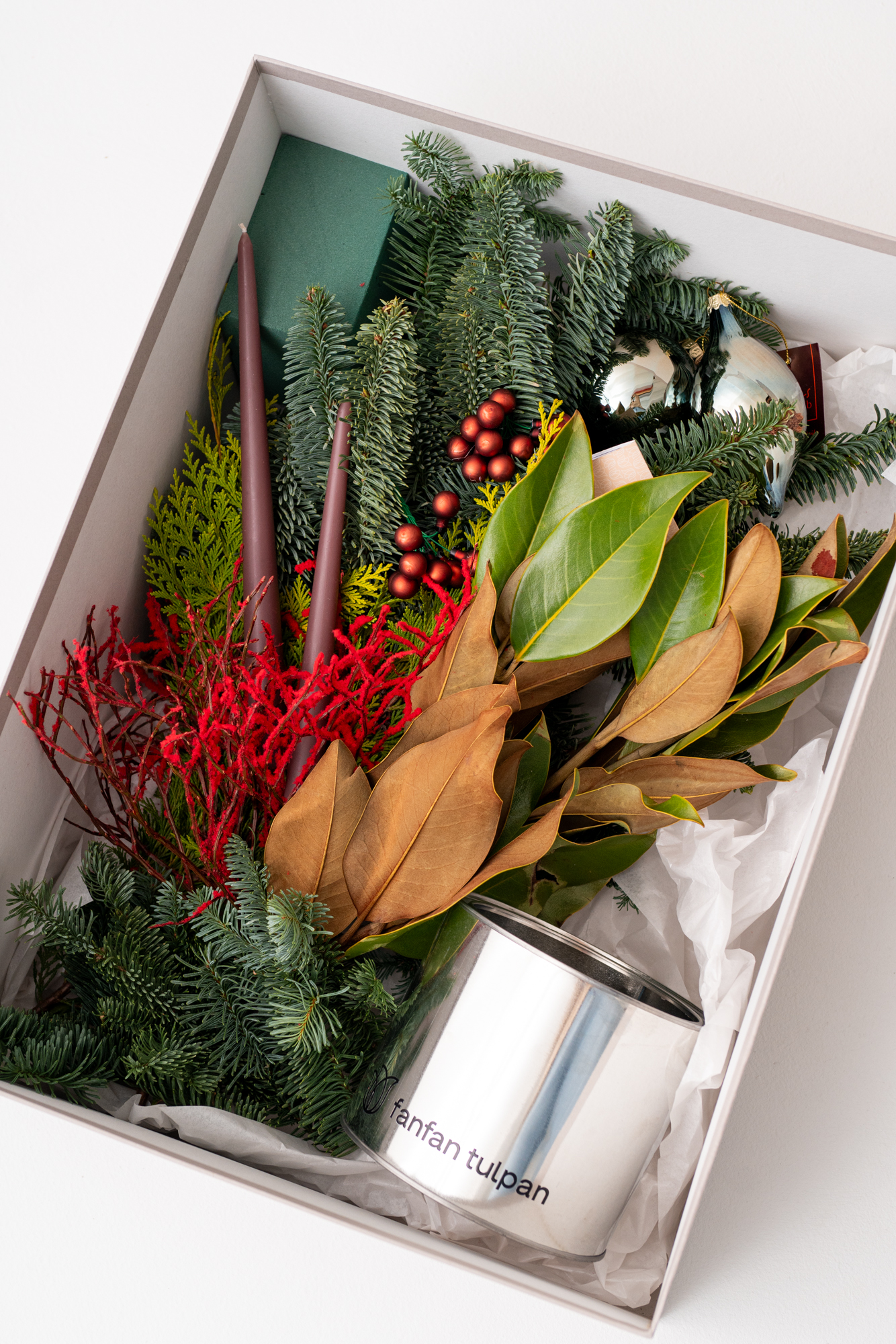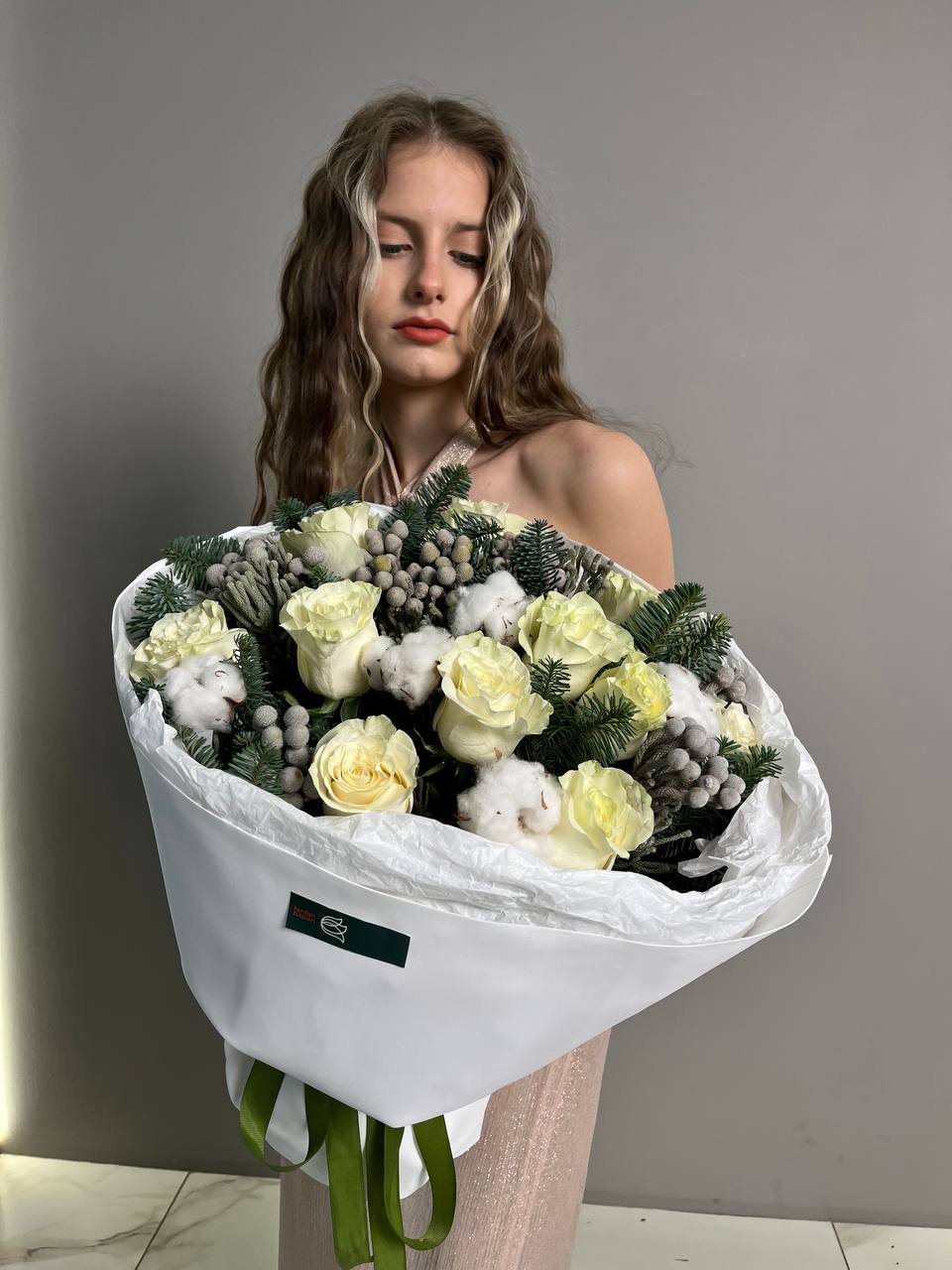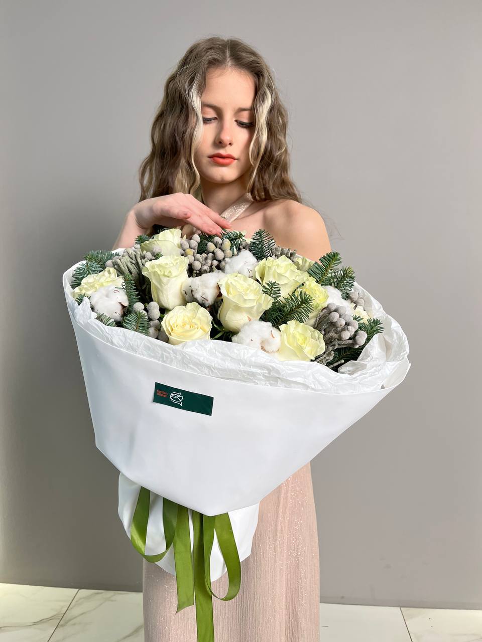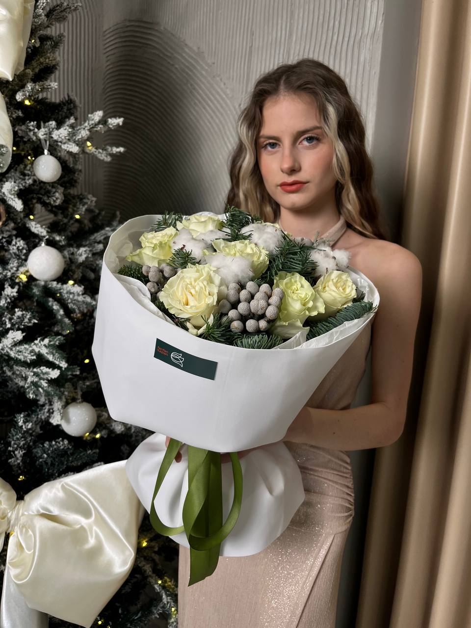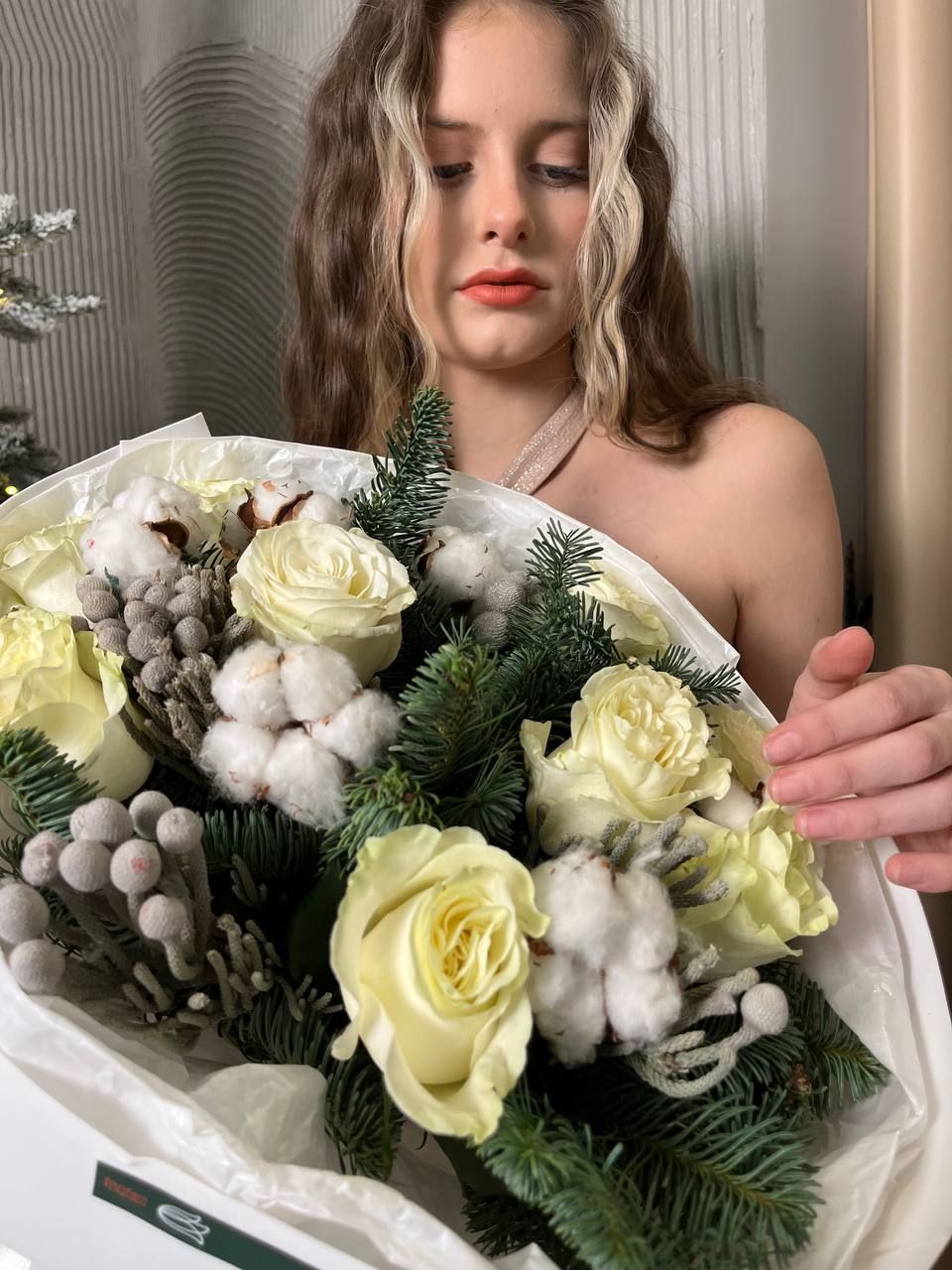 Новогодний букет из нобилиса, роз и хлопка — это стильное и ароматное украшение, которое создаёт атмосферу праздника. Такие композиции сочетают в себе благородную хвою нобилиса и мягкие коробочки хлопка, дополненные декоративными элементами.