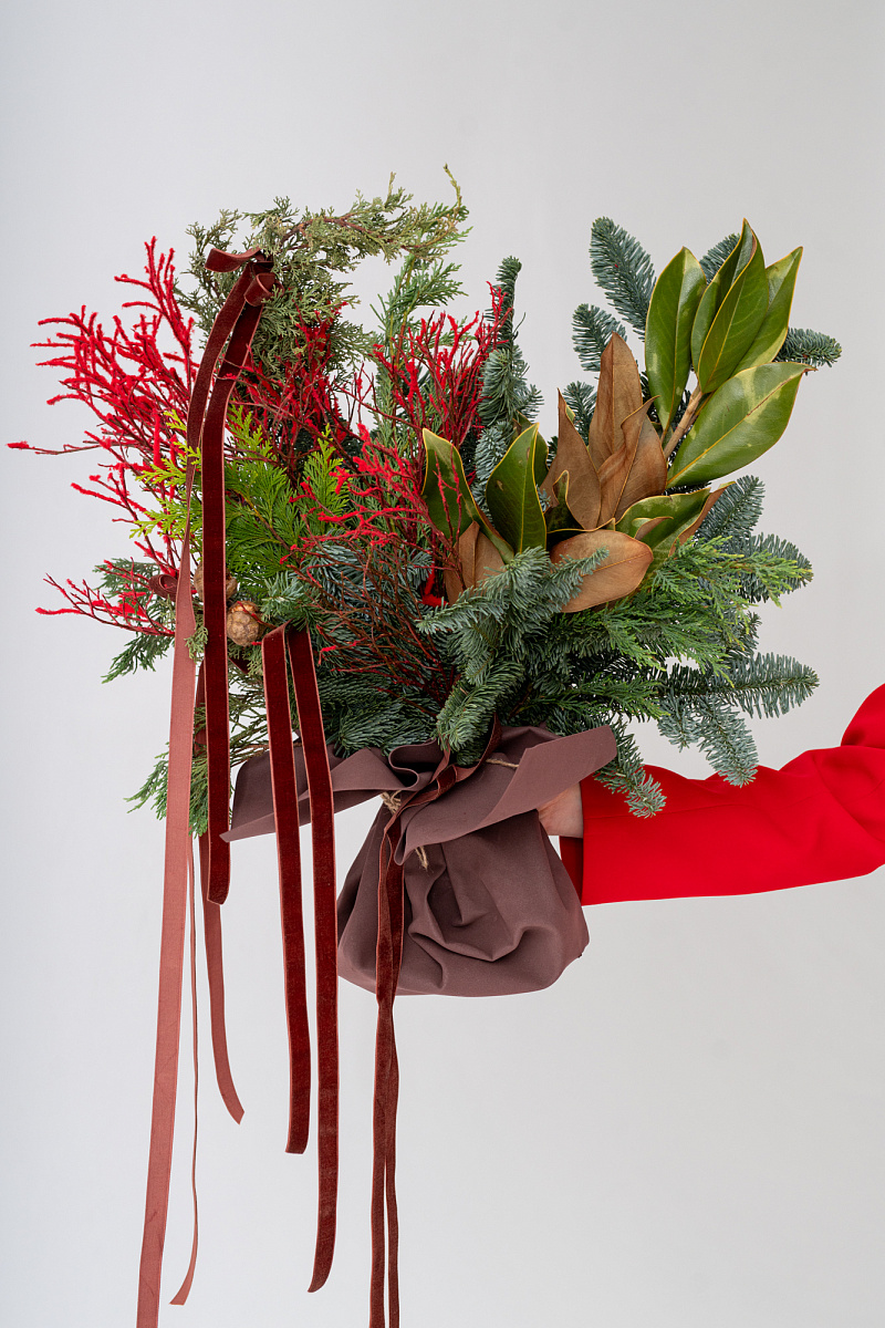 Новогодний букет из нобилиса и туи — это стильное и ароматное украшение, которое создаёт атмосферу праздника. Такие композиции сочетают в себе благородную хвою нобилиса и плотную структуру туи, дополненные декоративными элементами.