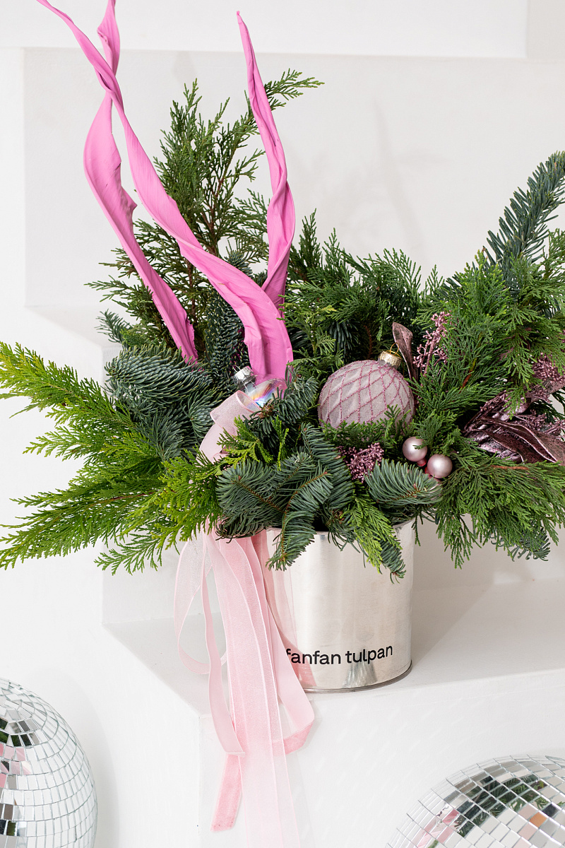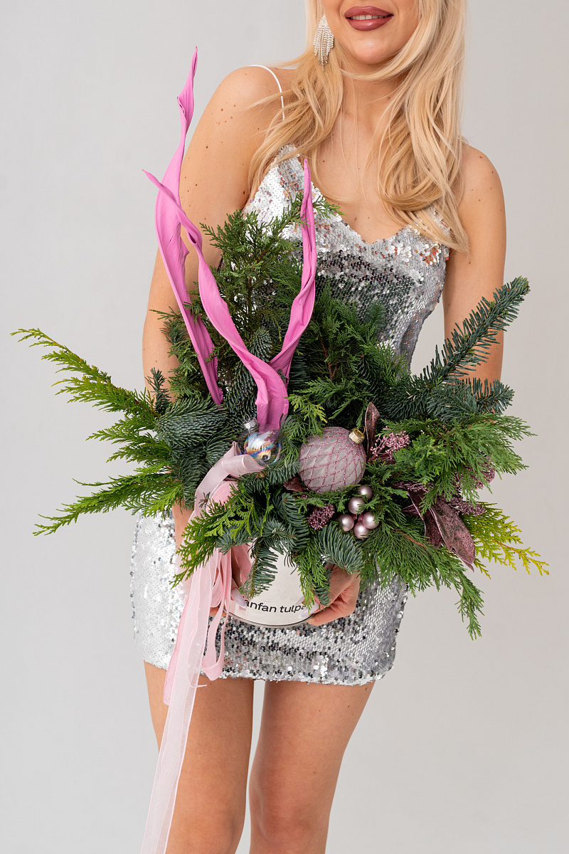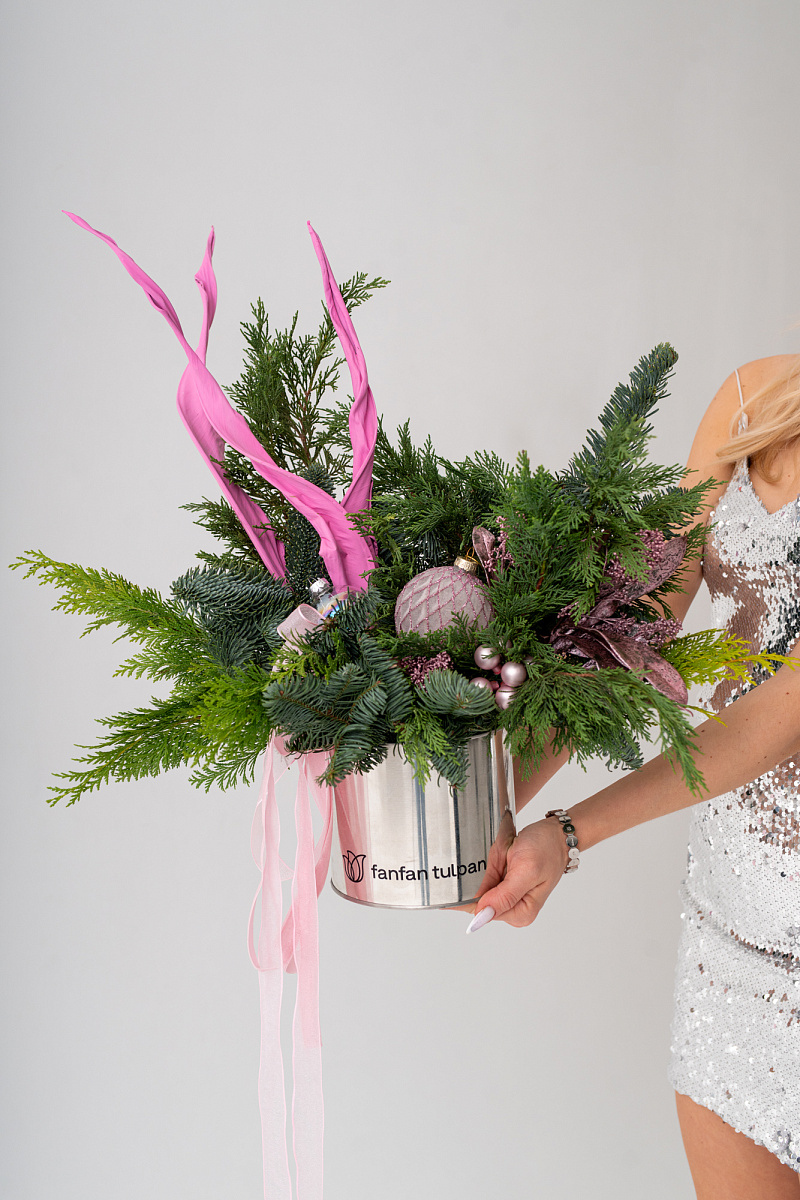 Центральный акцент — роскошные ветви нобилиса с их характерной серебристо-зеленой хвоей, создающие объемную и пышную структуру. Мягкие пушистые веточки туи дополняют композицию, добавляя текстуру и глубину.