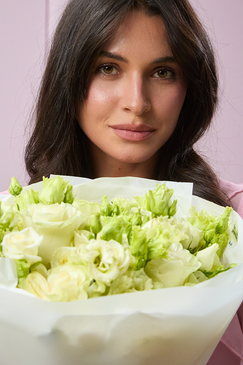 «Шарм роз» — изысканная цветочная композиция в благородной бело‑зелёной гамме, где чистота белых бутонов гармонично сочетается с сочной зеленью. Это воплощение элегантности и природной гармонии, способное стать выразительным подарком или утончённым украшением интерьера.